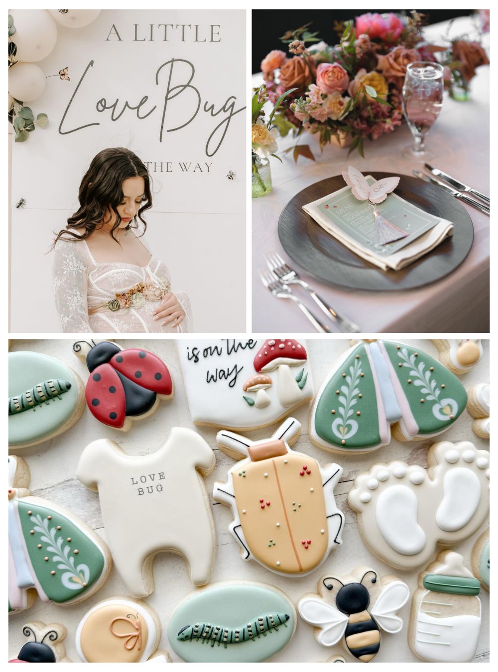 Order “lovebug” cookies or cupcakes and use faux bugs to decorate food trays and tables. Other earthy details will work well here, so consider adding mossy accents, wood slices, soft florals, botanicals, and mushrooms.