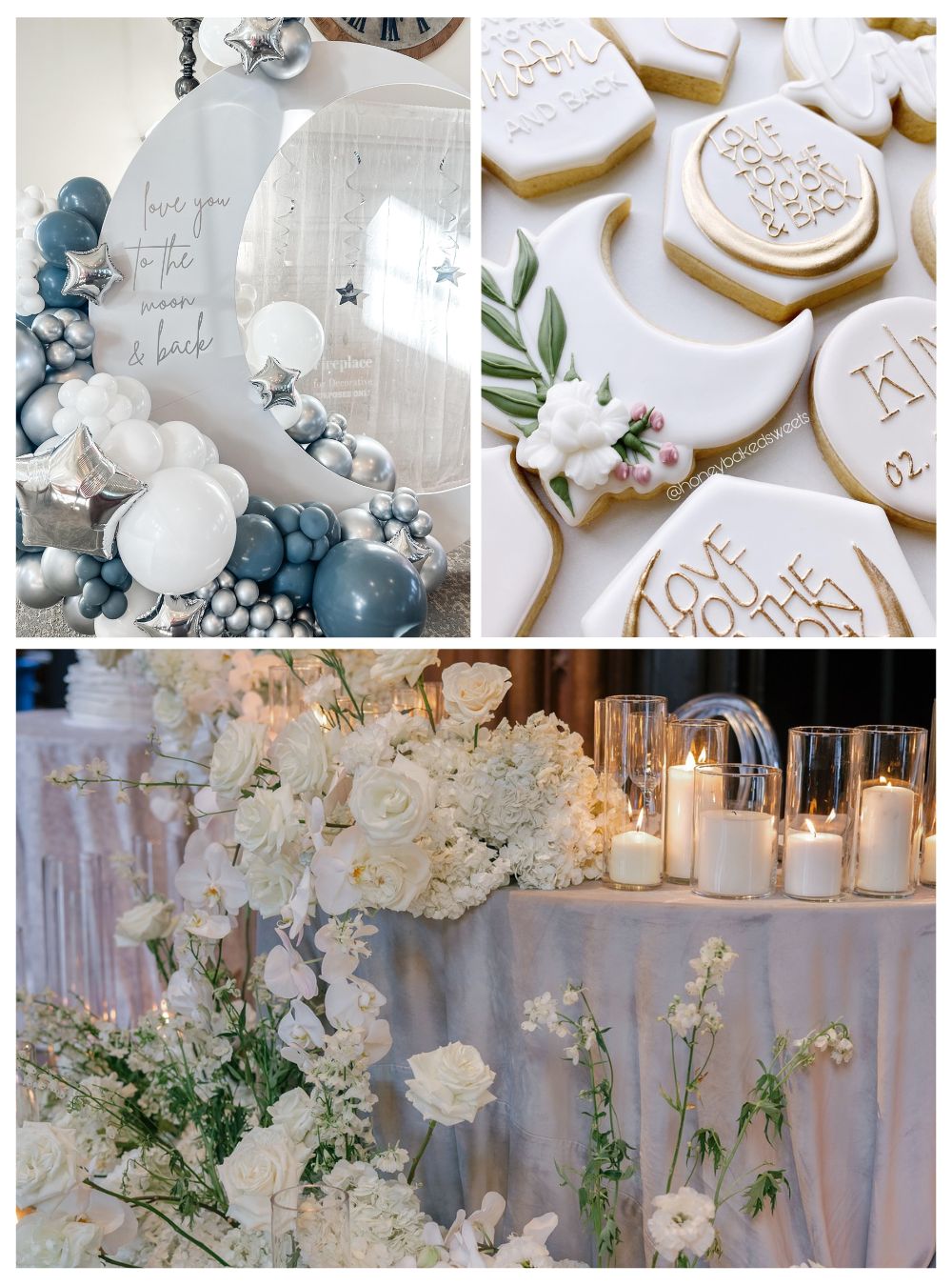 A dreamy celestial theme is perfect for something sweet yet whimsical. Pink or blue moons, silver stars, soft lighting, and fluffy cloud accents will set the mood, and don’t forget to add twinkly lights for a magical feel!