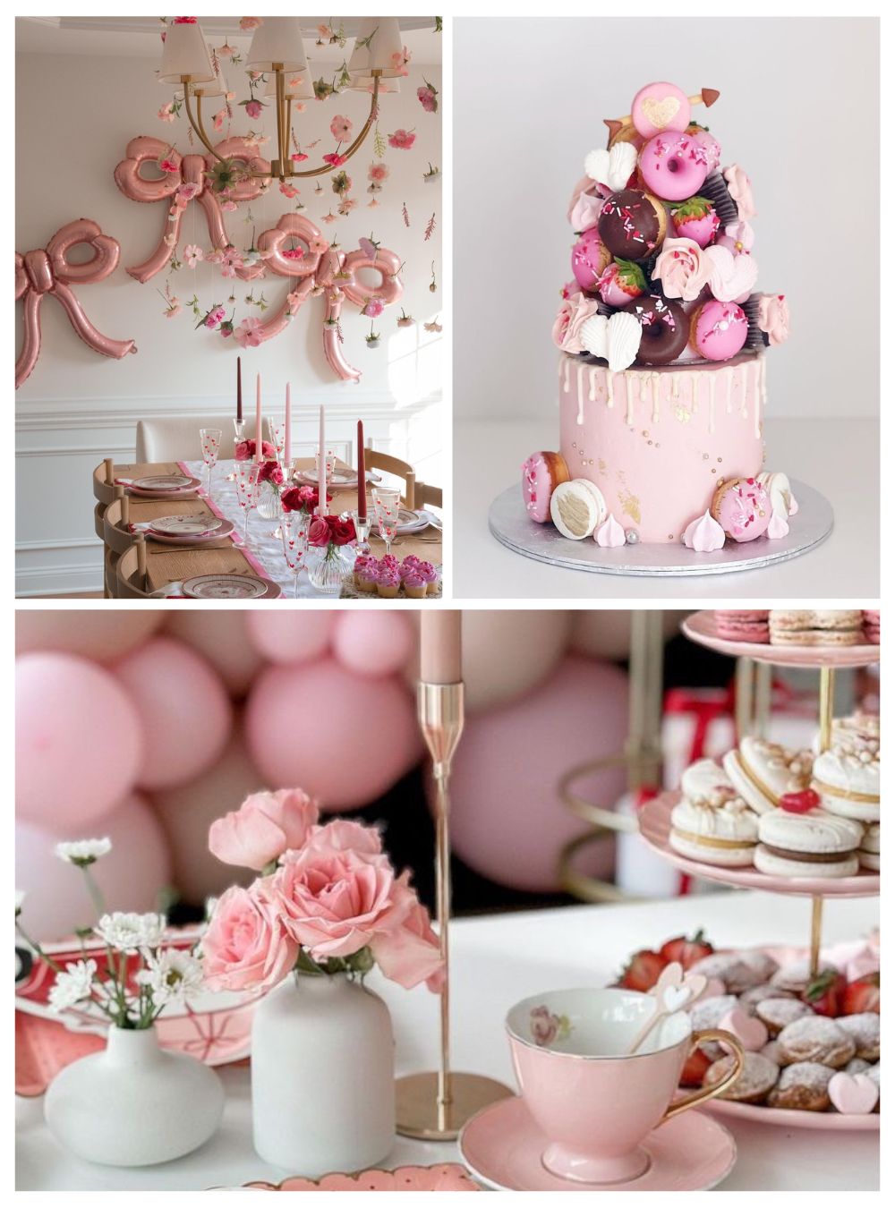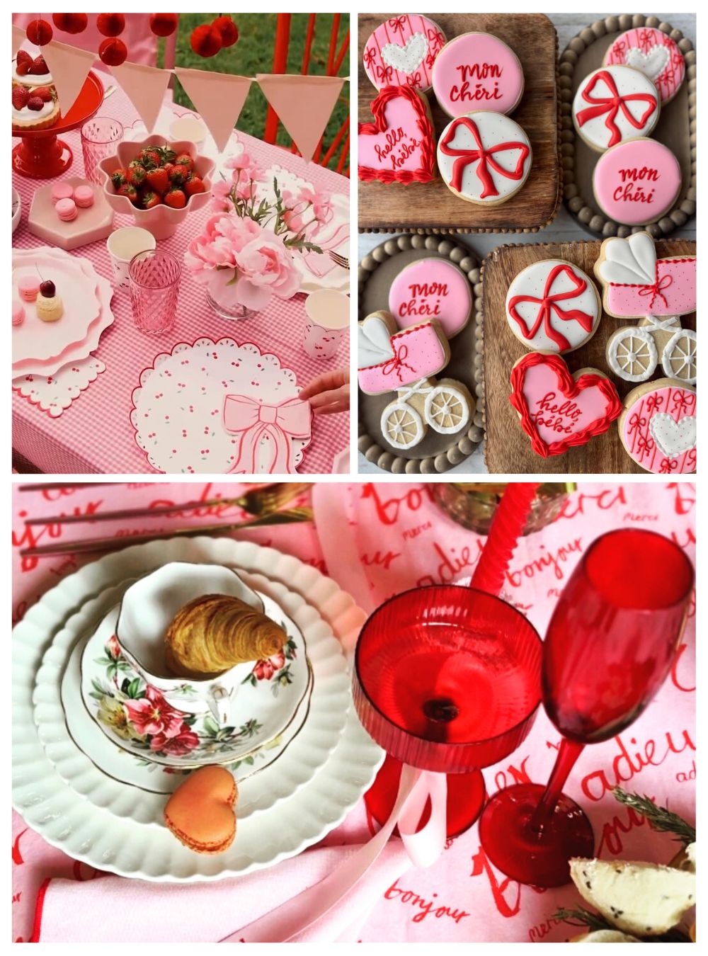 Create Parisian Cafe vibes with mini croissants, macarons, and fresh heart-shaped strawberries. Soft pink tones, red roses, Eiffel tower accents, and dainty bows are perfect finishing touches for this theme!