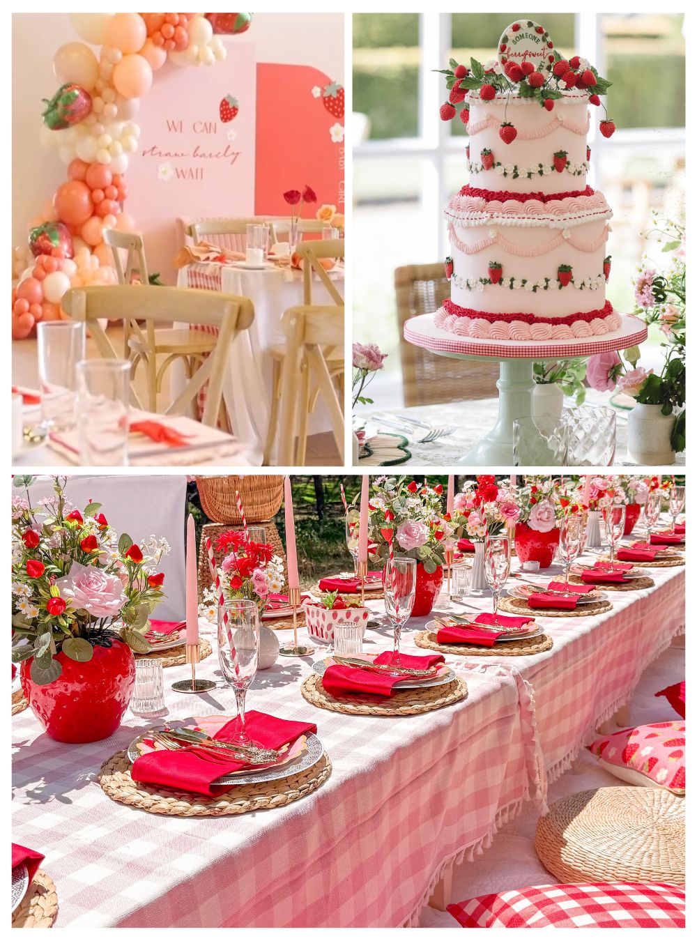 Bright, sweet strawberries are also heavily associated with V-Day, so a We Can Straw-barely Wait to Meet You shower is perfect in February 2026. Lean into the red and pink tones, and use gingham patterns, berry motifs, and berry decor throughout the table settings.