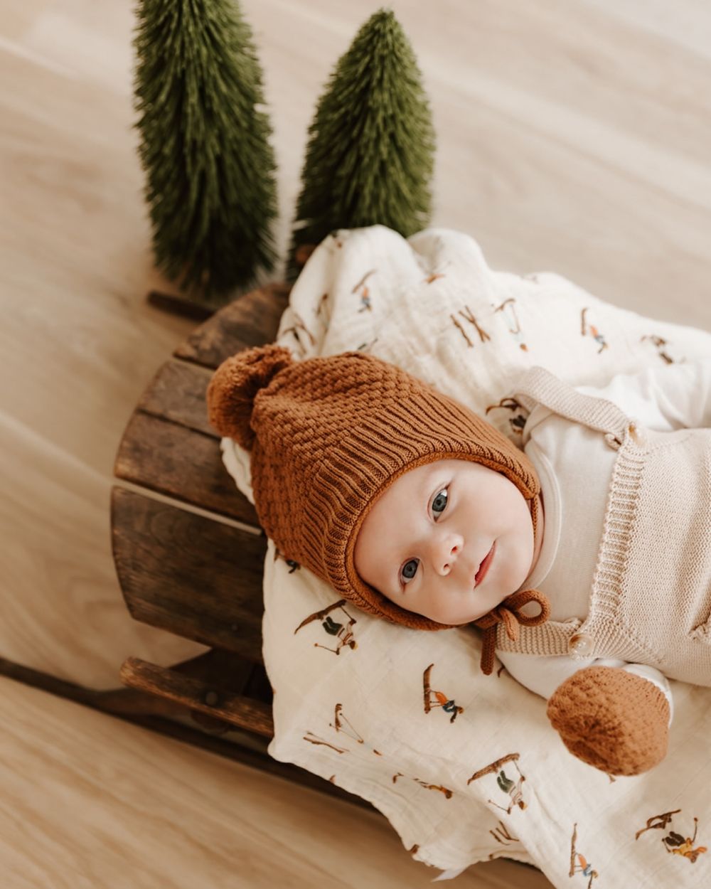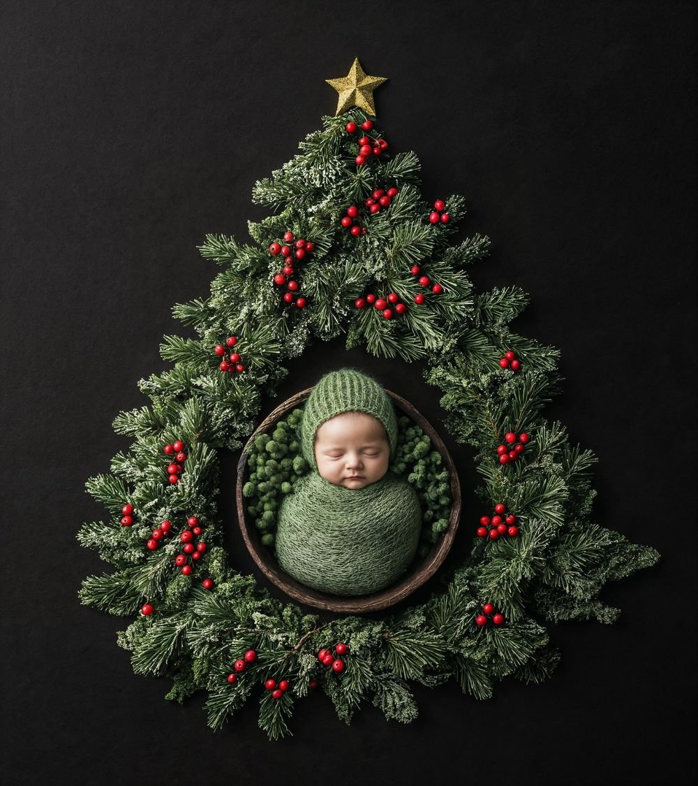Swaddle your newborn in a pine green blanket and beanie, surrounding them with faux pine branches and red berries to create a teeny tiny baby tree. Don’t forget to add the gold star on top!