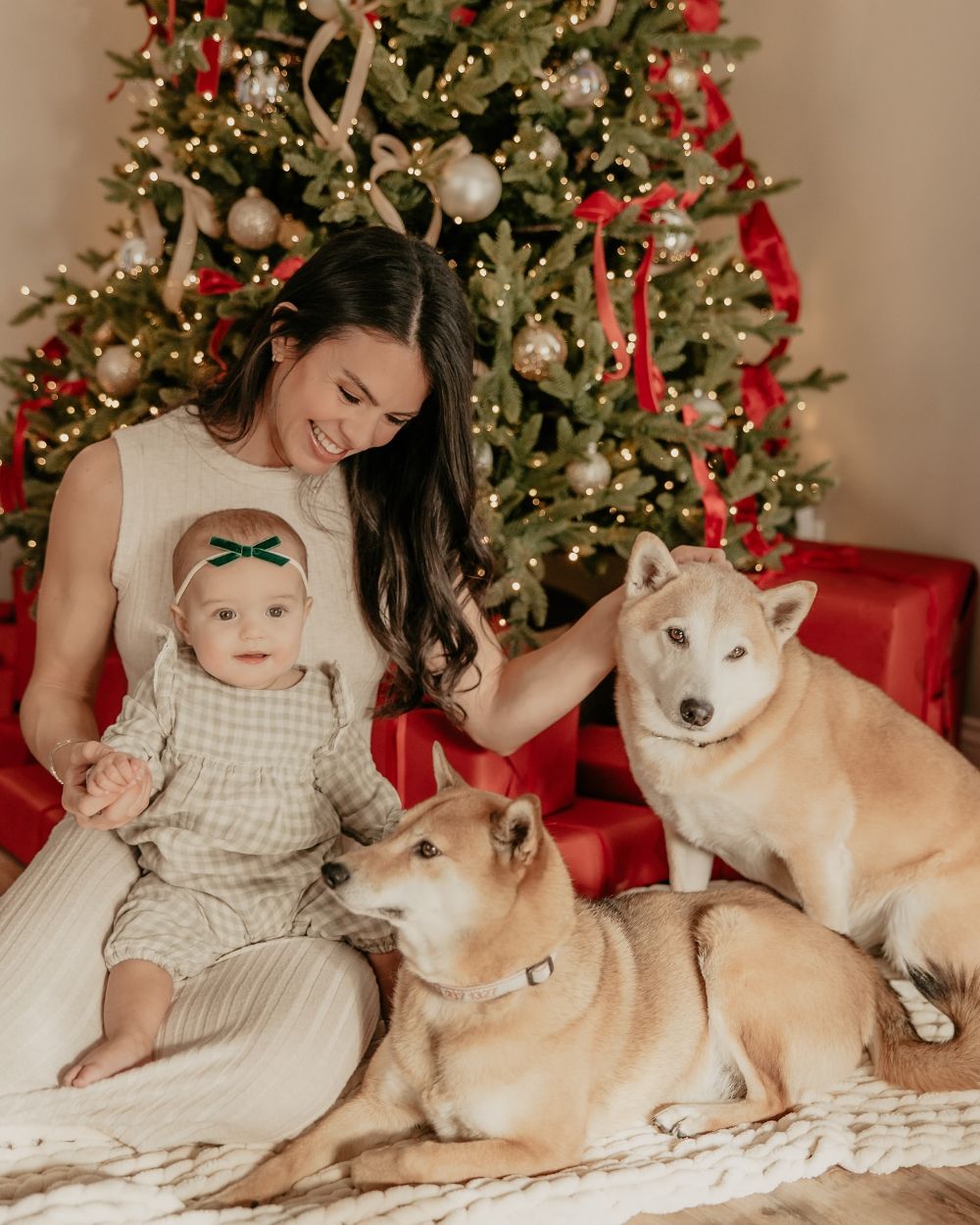 Pose in front of the tree with your little one and the family pets for a truly adorable portrait that the whole family will love!