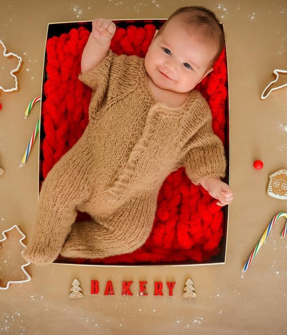 Use a cozy caramel knit onesie to dress your baby like a little gingerbread, then decorate the scene with cookie cutters, peppermint sticks, gingerbread treats, and pops of red candy!