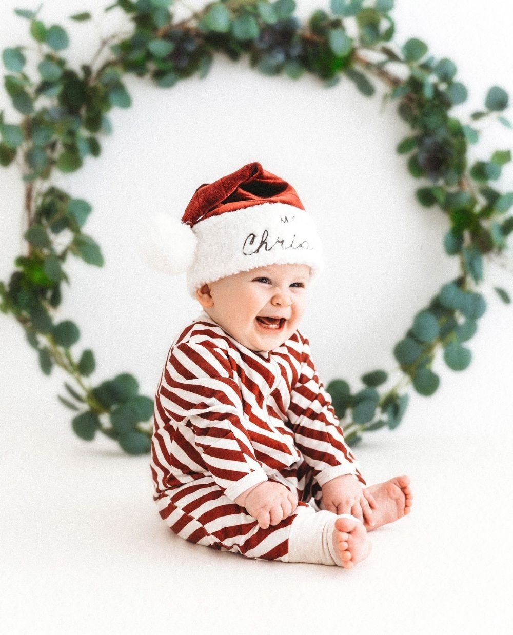 A candy cane striped onesie is perfect for a baby’s first Christmas photo, and it pairs so well with toothy smiles and giggles!
