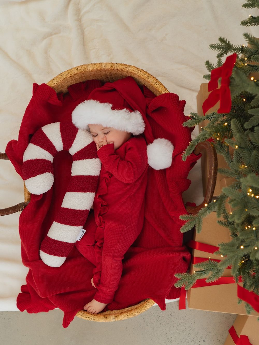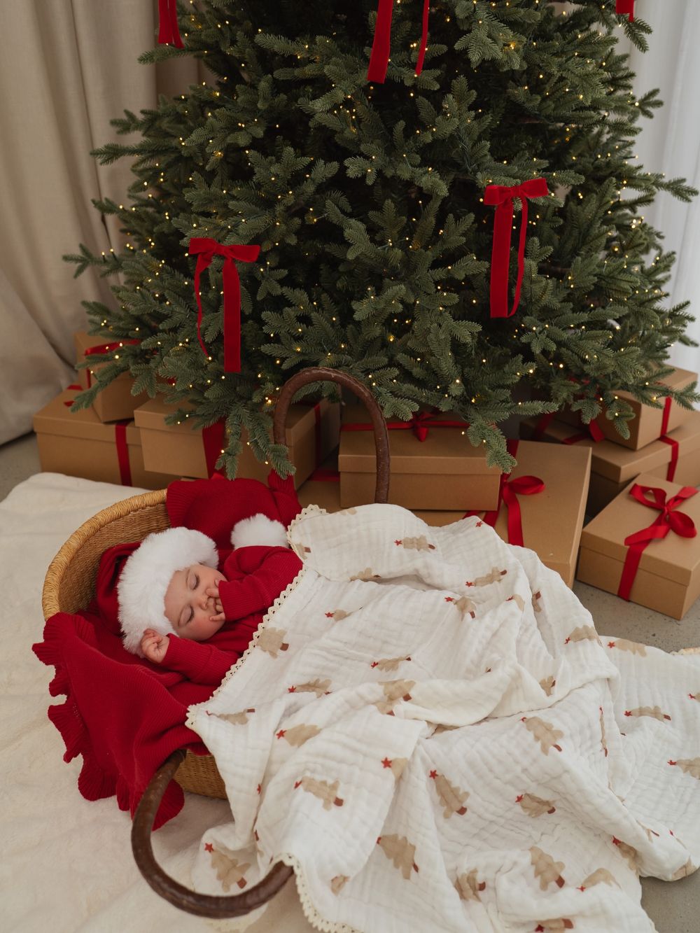 Gently lay your slumbering baby in an oversized basket full of plush, holiday blankets to make it seem like you have an extra special present under the tree this year!