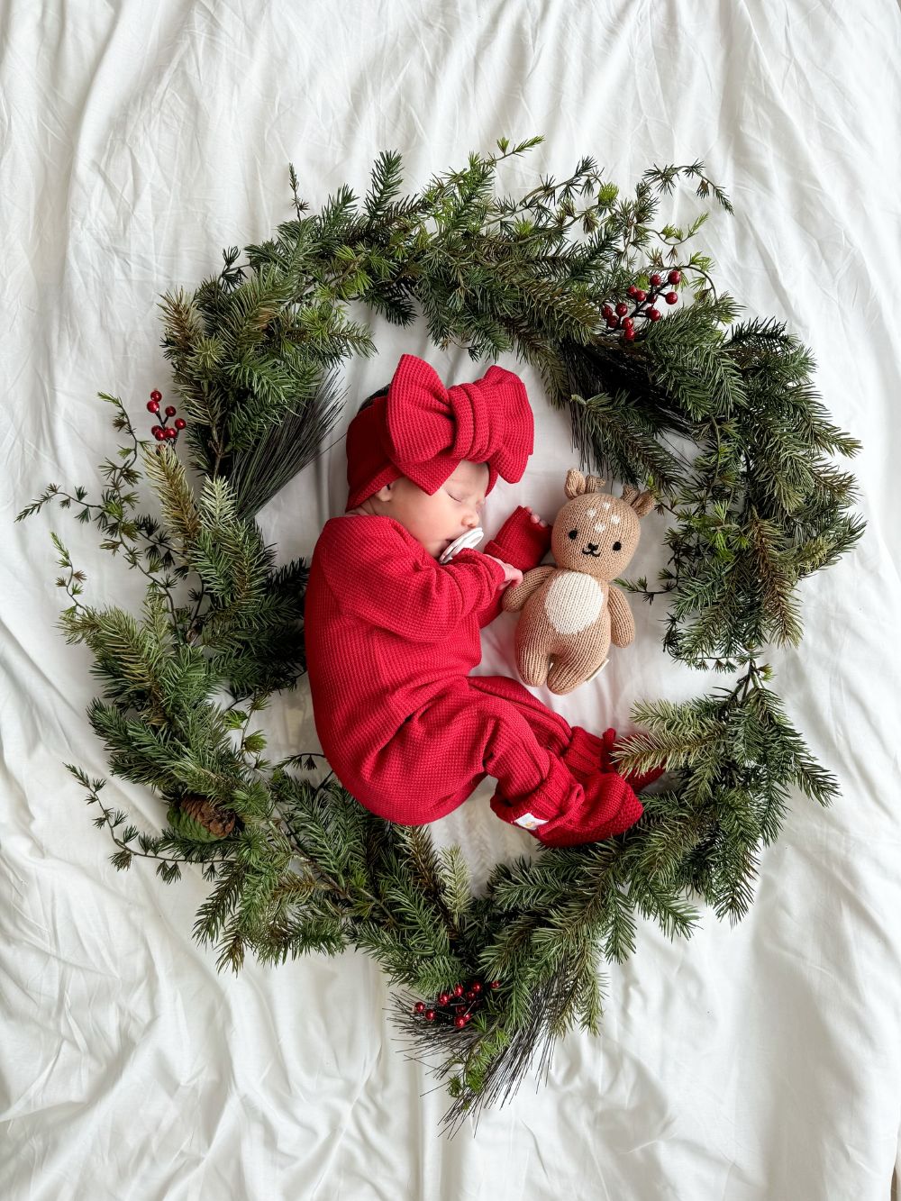 As your baby naps, surround them with faux pine branches, pinecones, holly berries, and other traditional wreath decor to recreate this cute photograph.