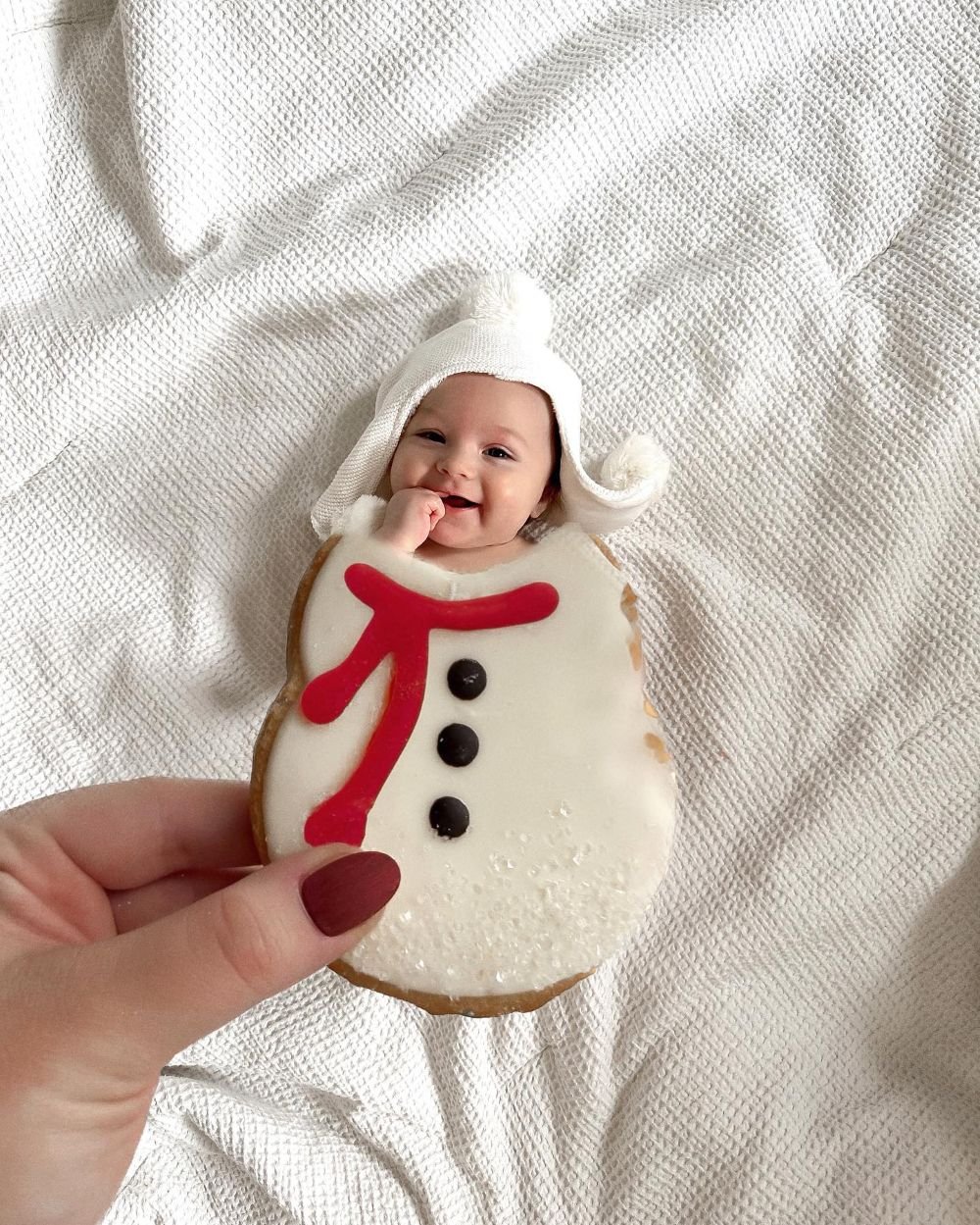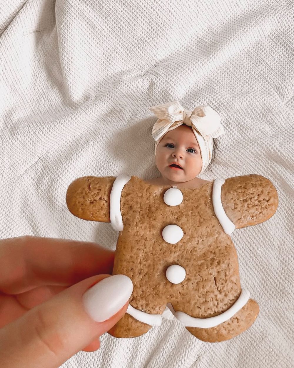 Cut the top off a Christmas creature cookie and hold it above your baby to make them look like a snowman, gingerbread man, elf, and more!