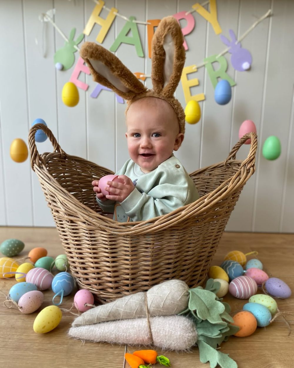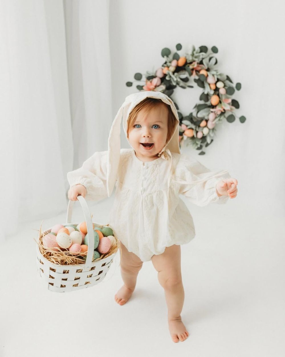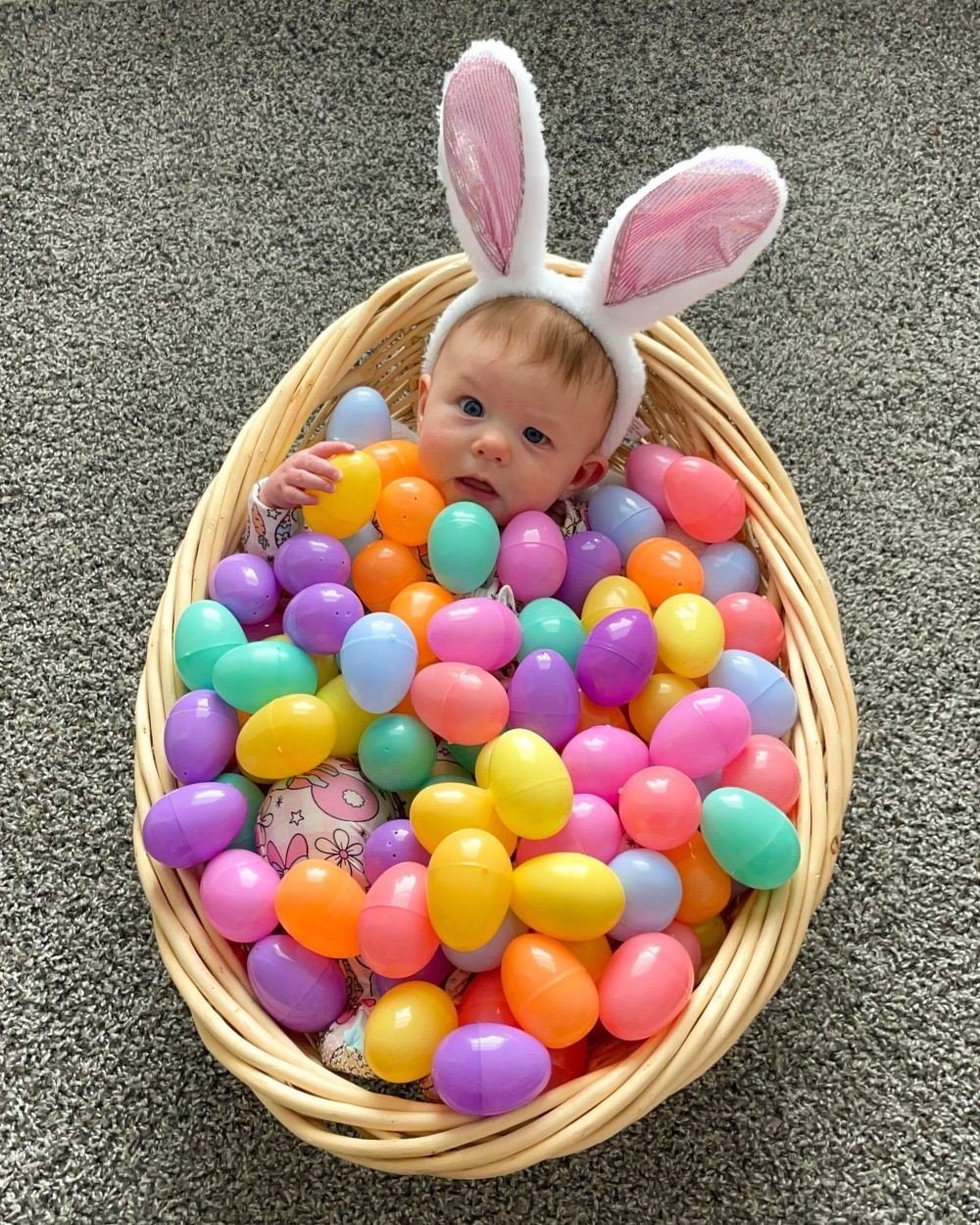 Place your baby in a soft-lined basket and surround them with pastel eggs (or vibrantly colored ones if you prefer) for a fun and memorable Easter scene! Don’t forget the bunny ears for another playful touch.