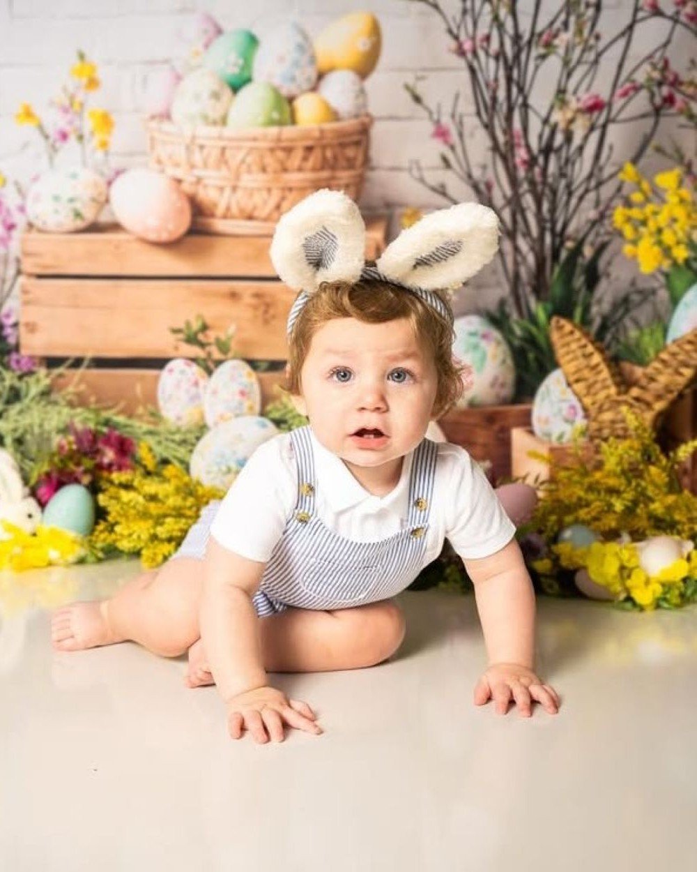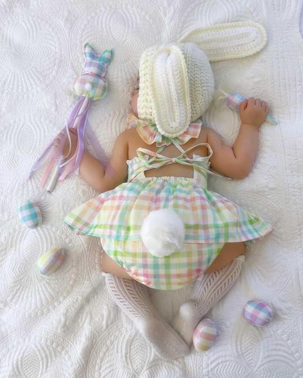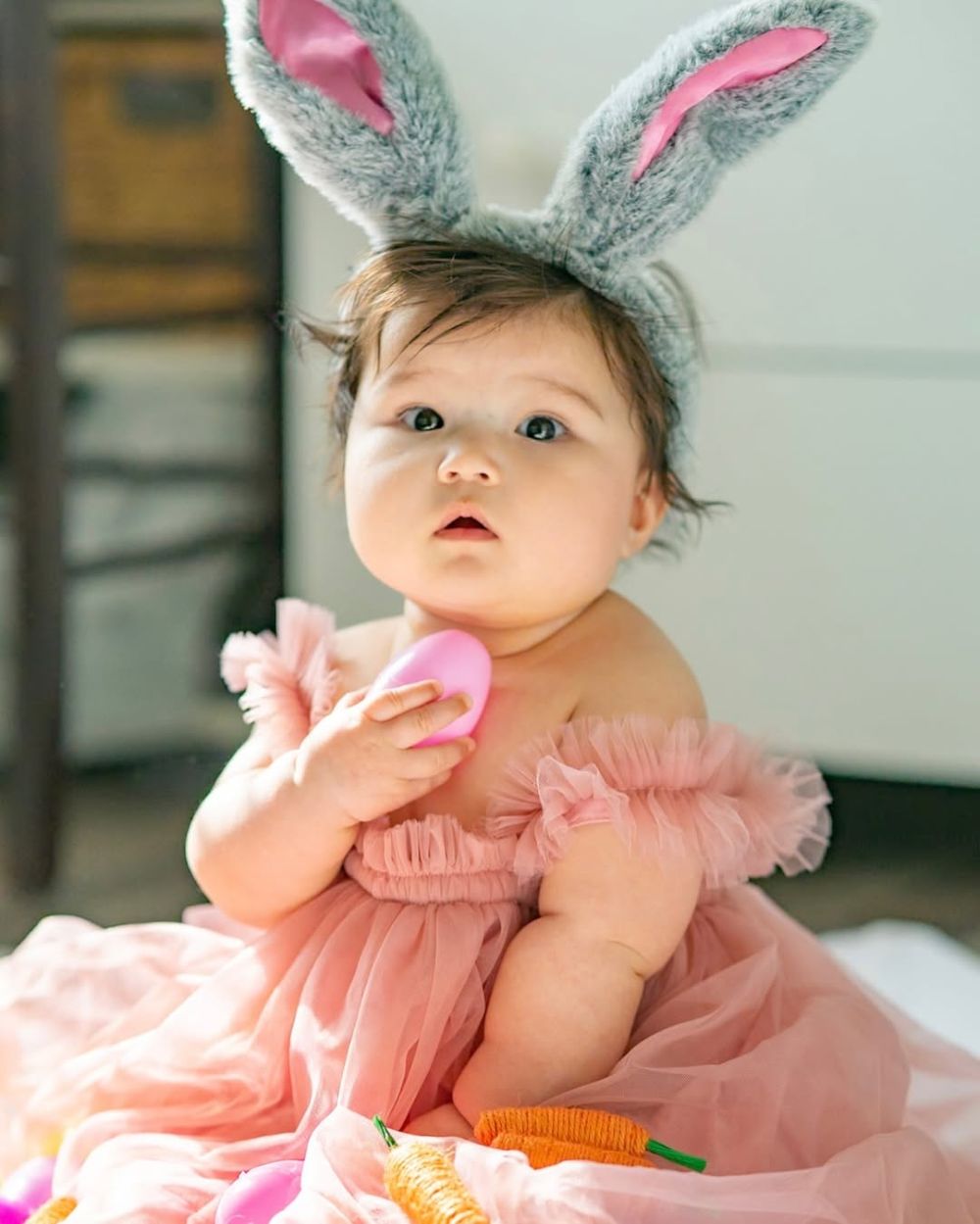 Invest in a beautiful dress for your baby girl, choosing one made from pink tulle or chiffon for a special look. Then, add bunny ears and scatter pastel eggs for a soft, playful look.