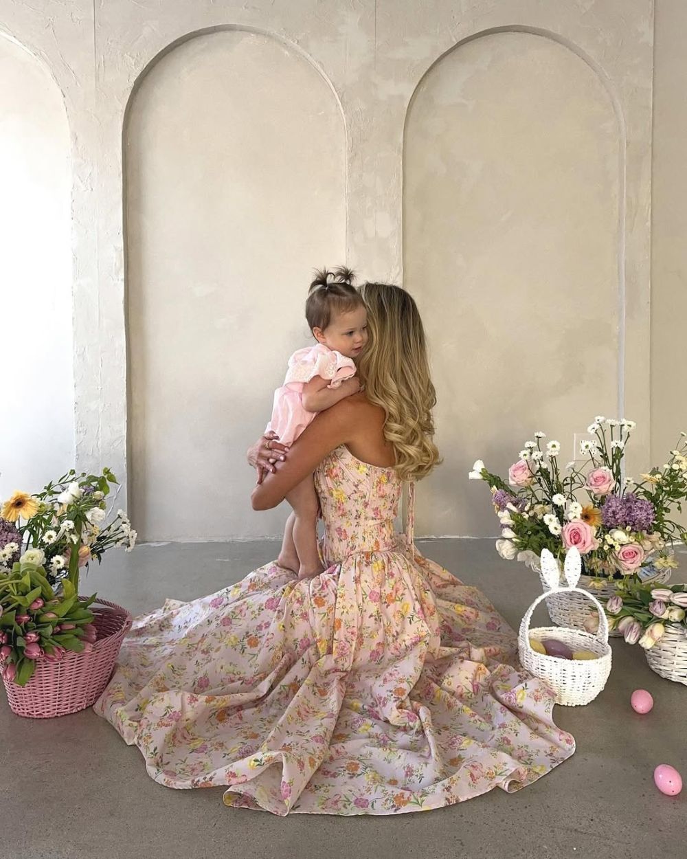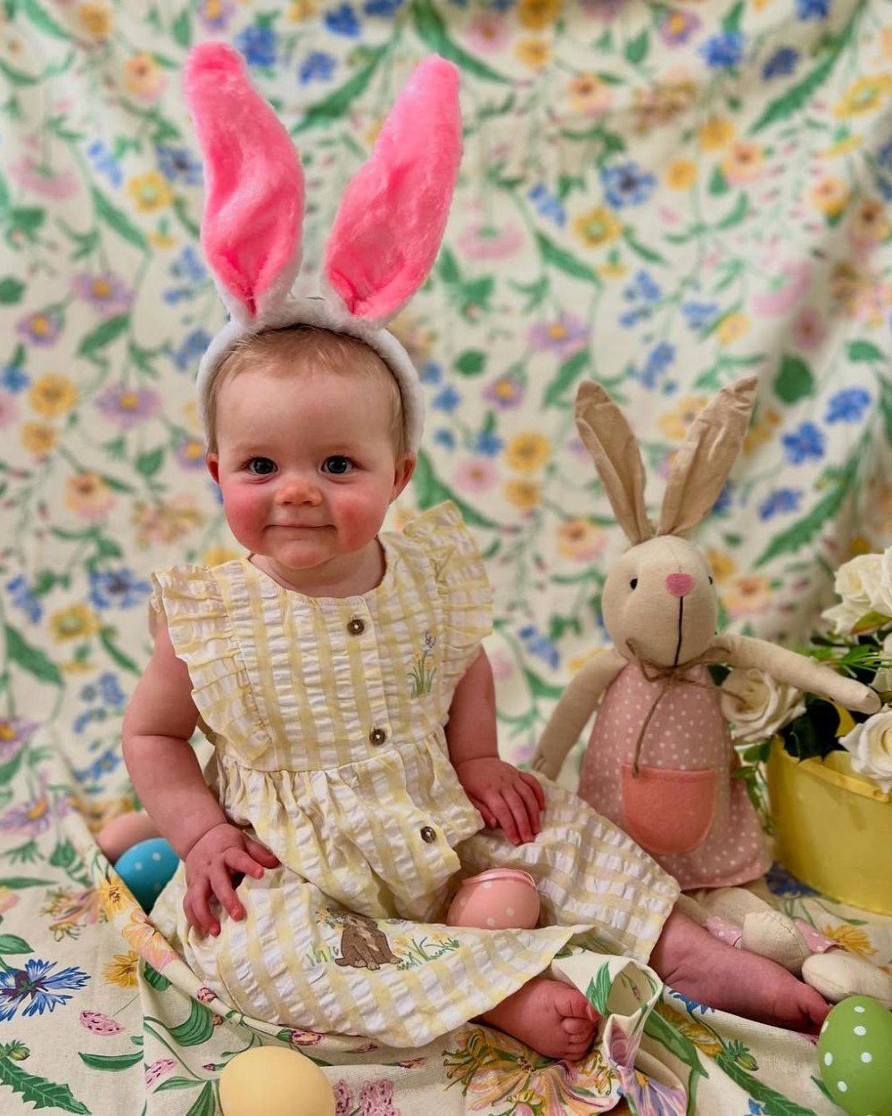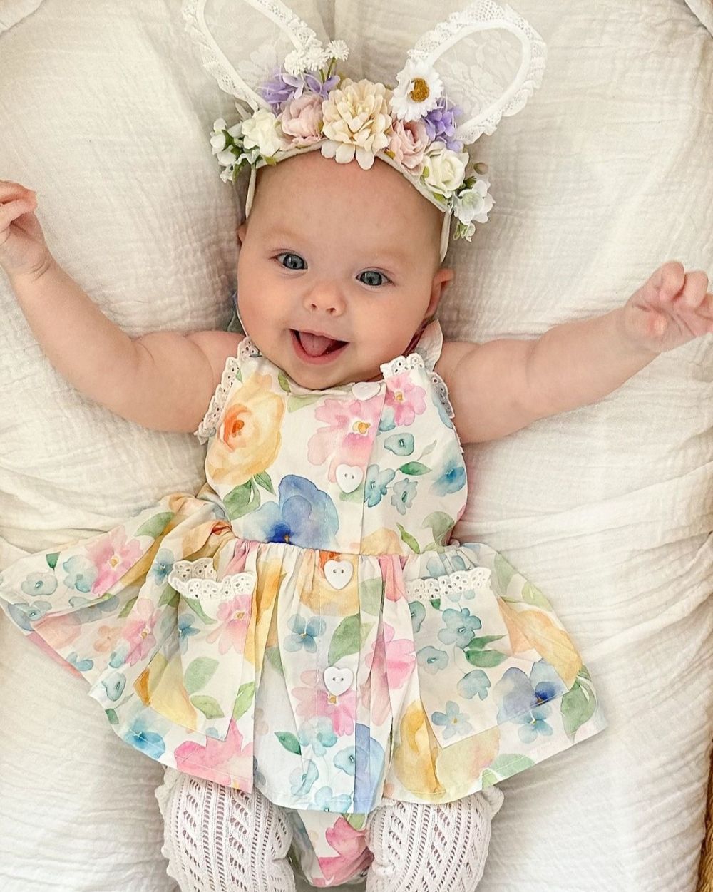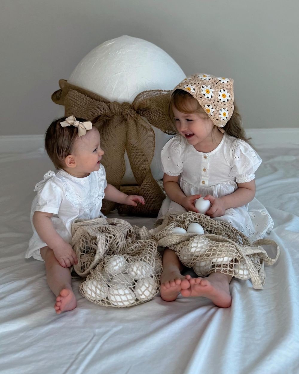 Invest in a beautiful dress for your baby girl, choosing one made from pink tulle or chiffon for a special look. Then, add bunny ears and scatter pastel eggs for a soft, playful look.