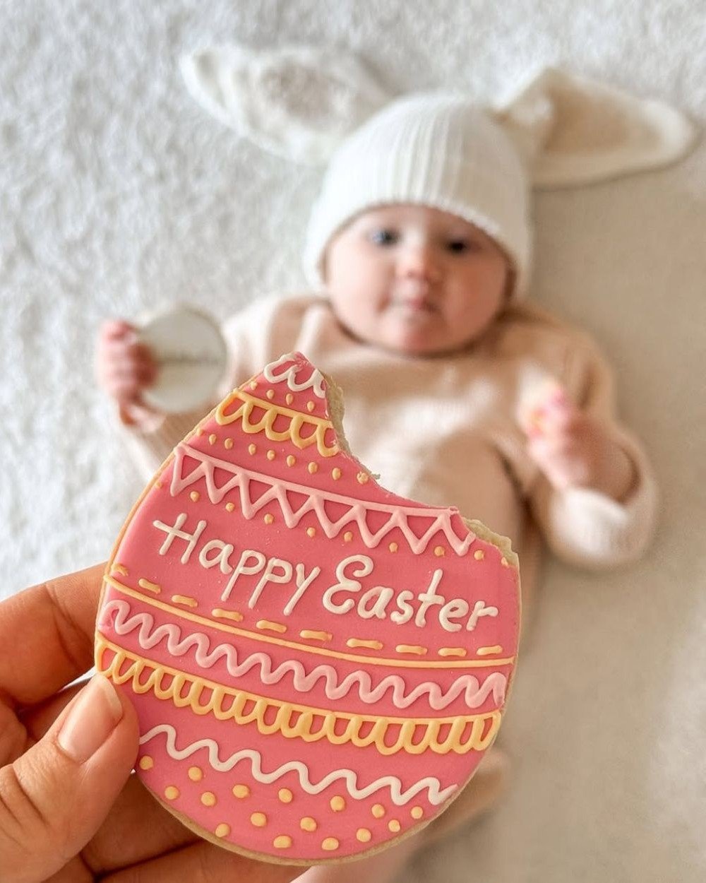 Hold an Easter-themed cookie above your baby as they rest on a soft blanket for a playful and colorful shot.