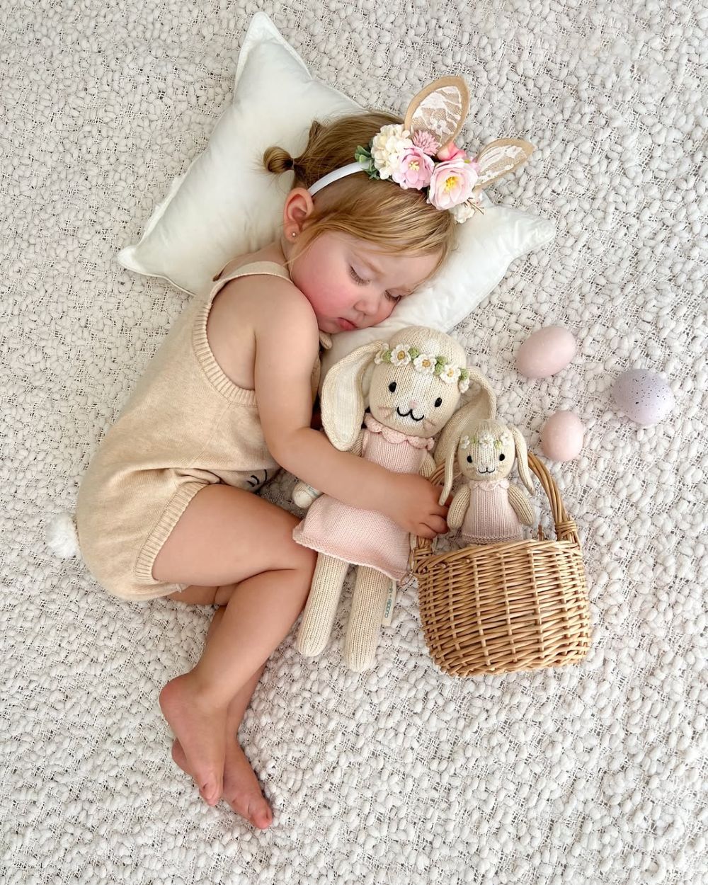 Dress your baby in a sweet, whimsical set of bunny ears, featuring lace and florals. Then set the scene with a wicker basket, a beautiful knit bunny, and fabric eggs.