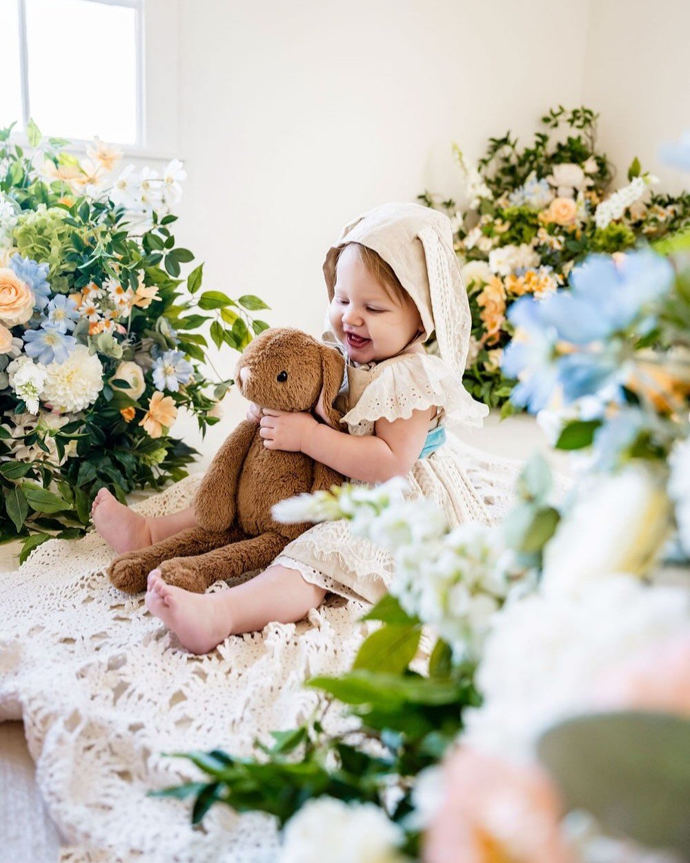 Surround your baby with flowers, greenery, and a stuffed bunny on a vintage-style blanket for a lush springtime look!