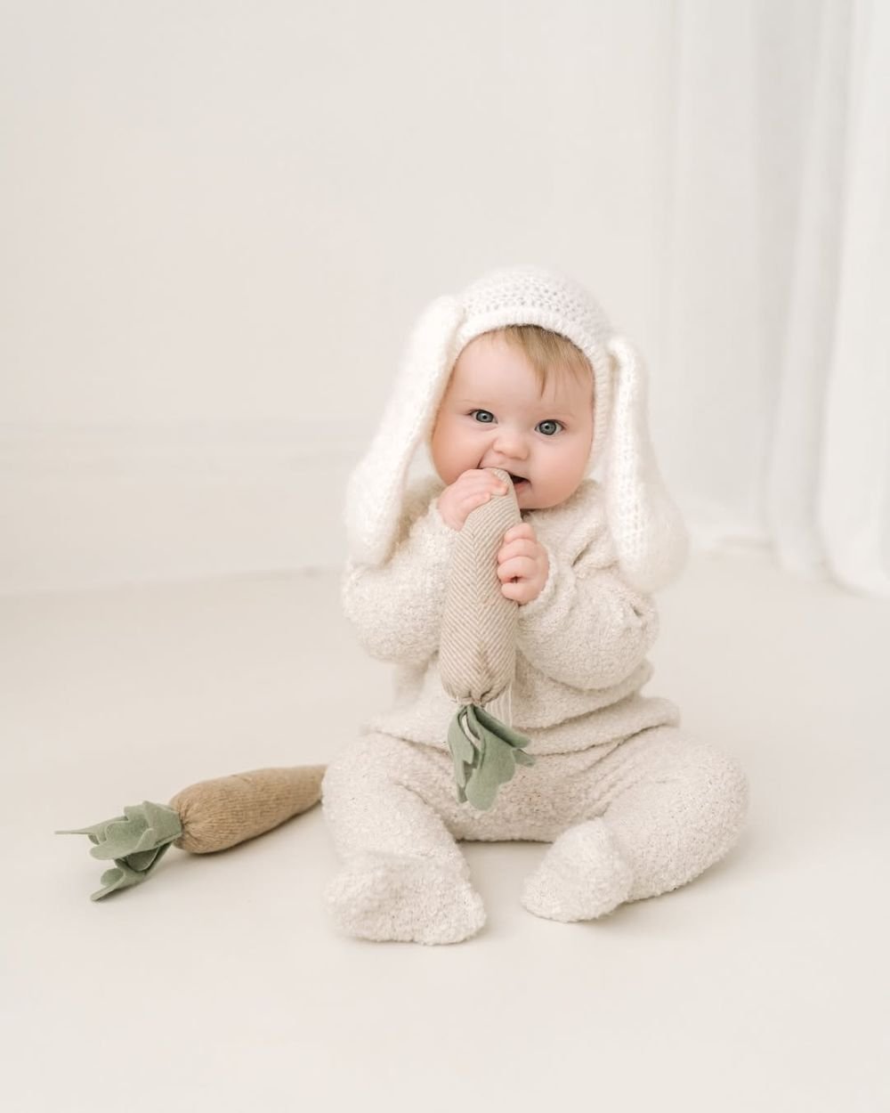Let your little one gnaw on real or faux carrots in an outdoor setting for a rustic and playful garden-inspired shot.
