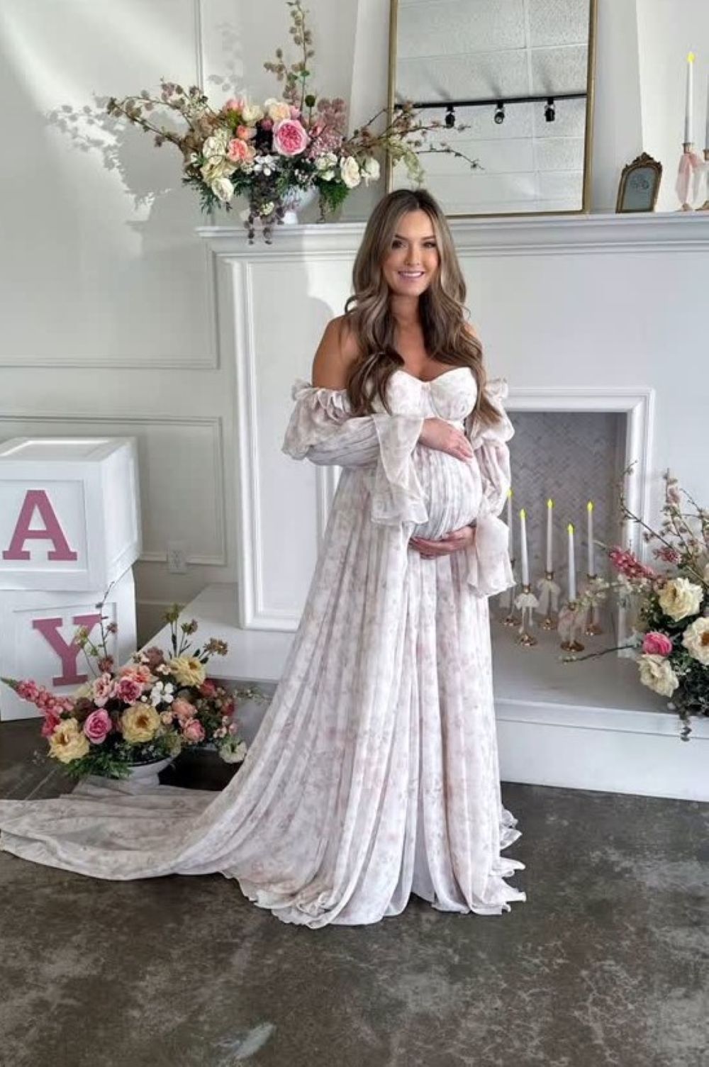 A floral dress featuring a long train, a corset bust, and billowing off-the-shoulder sleeves definitely has a princess vibe!