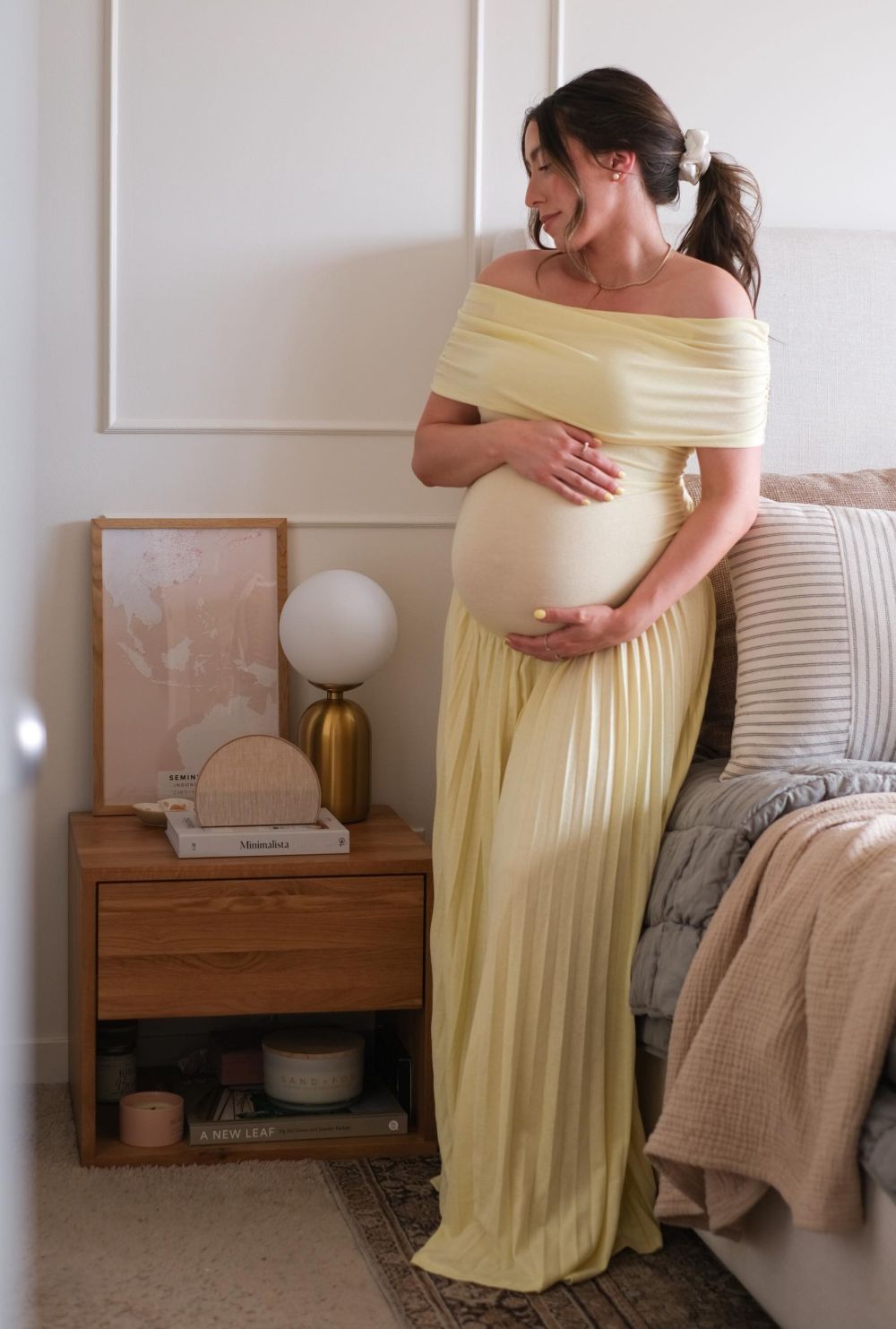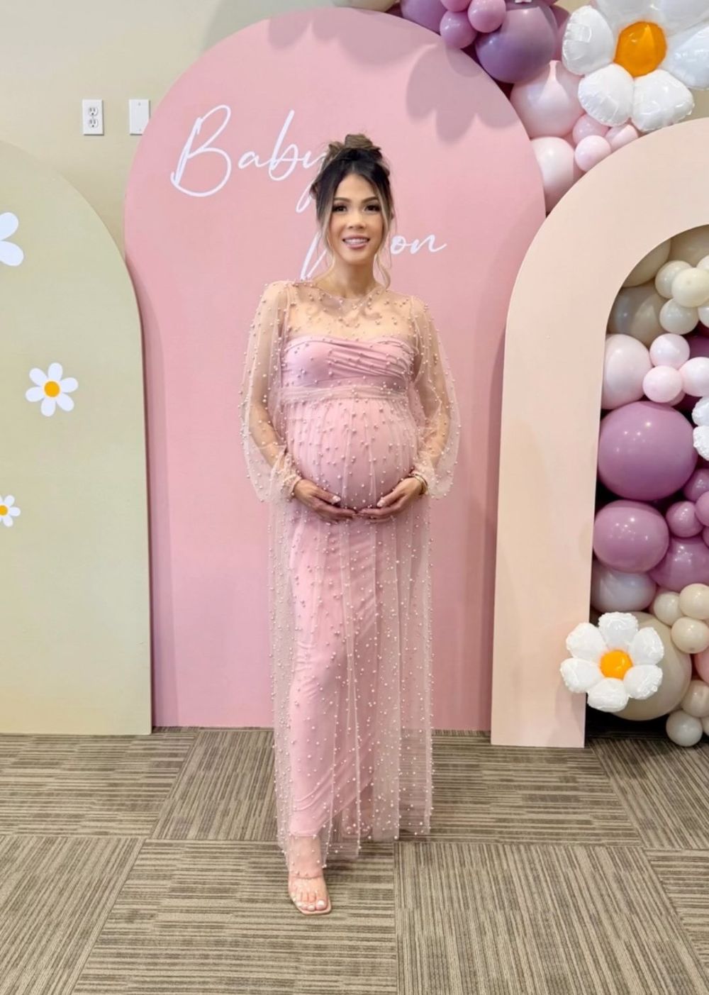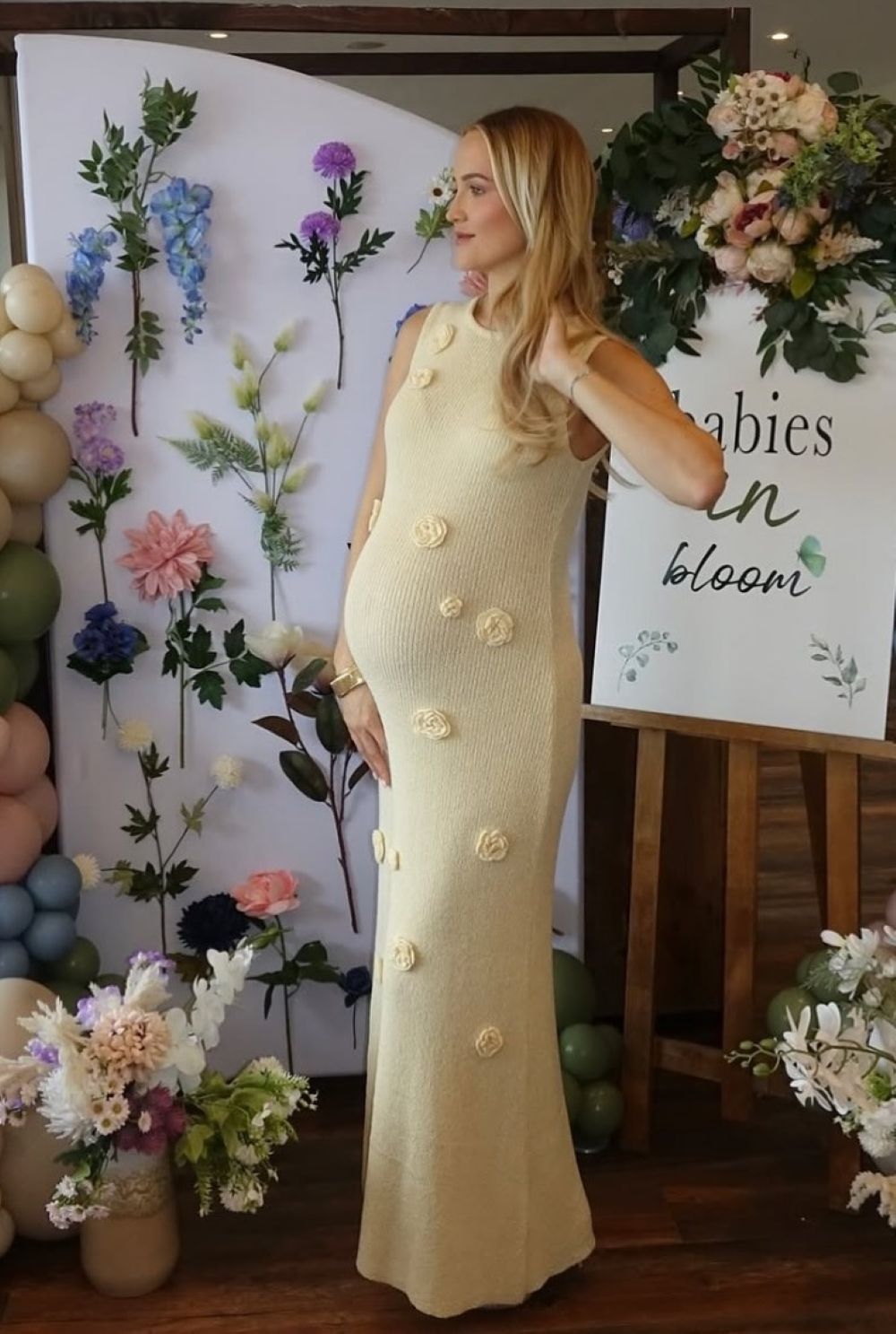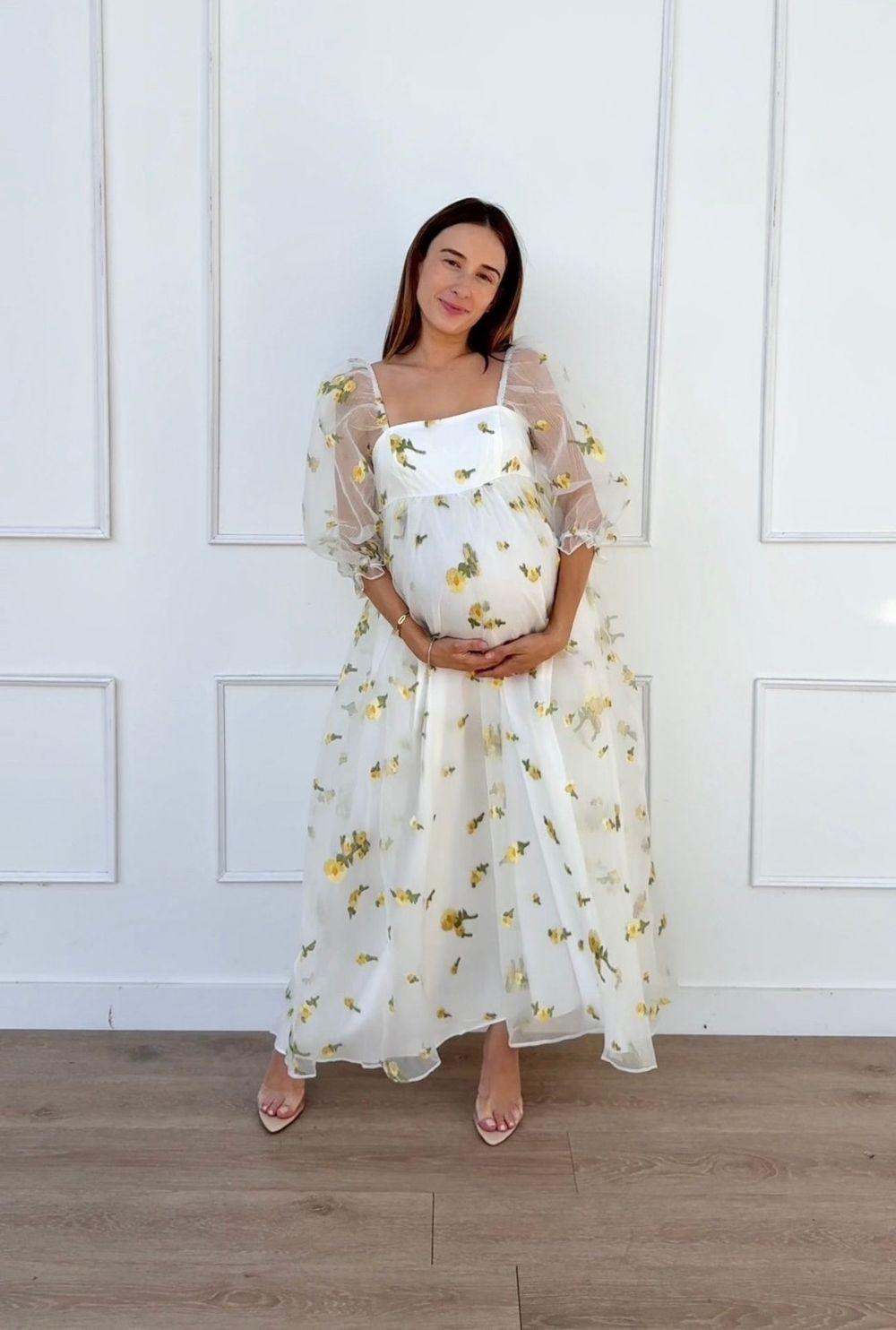 A light yellow, plush maxi dress with floral embellishments is gorgeous and perfect for a spring gender reveal party!