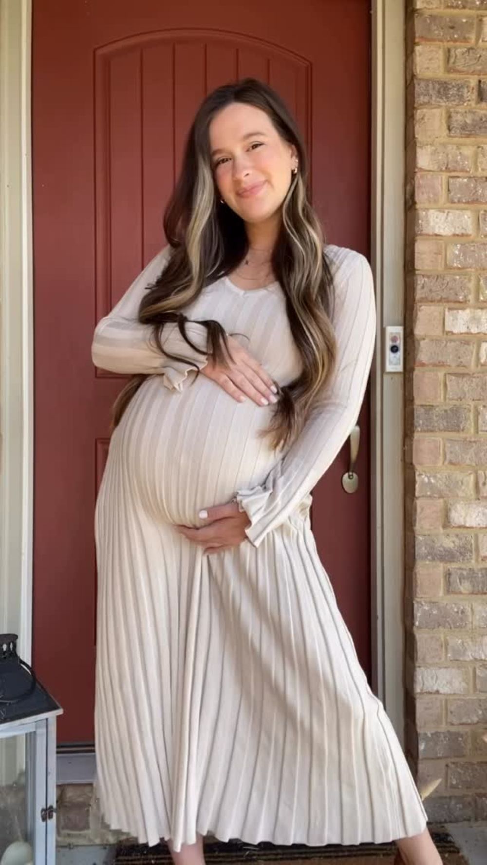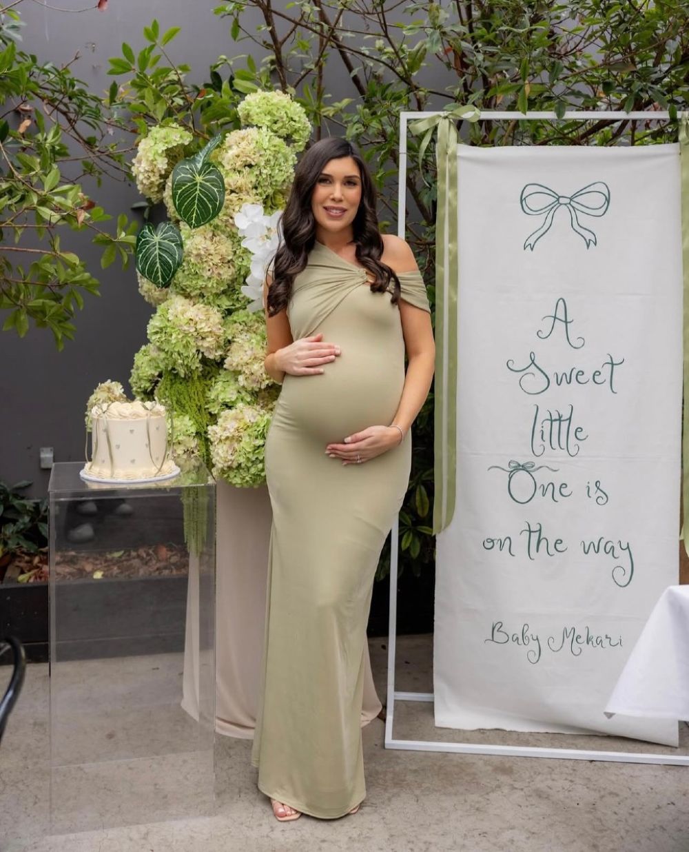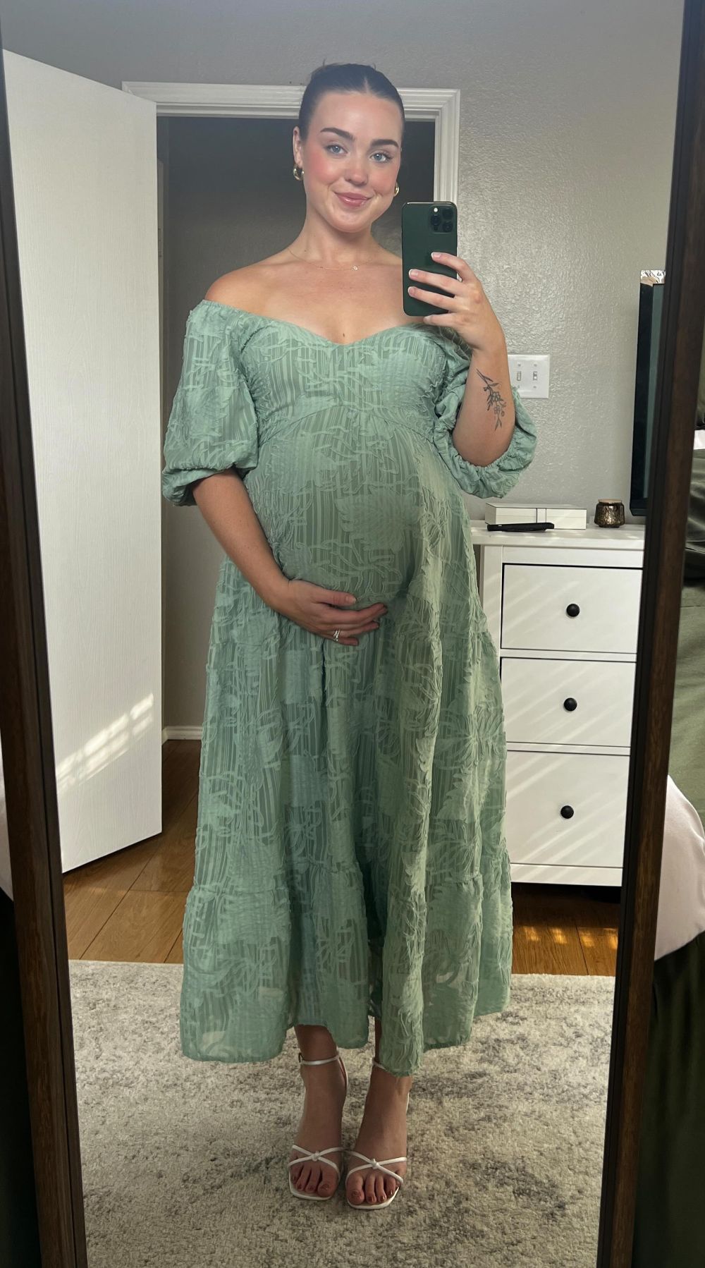 Soft sage and this unique silhouette are a gorgeous combination, and I love this for a modern gender reveal outfit idea.