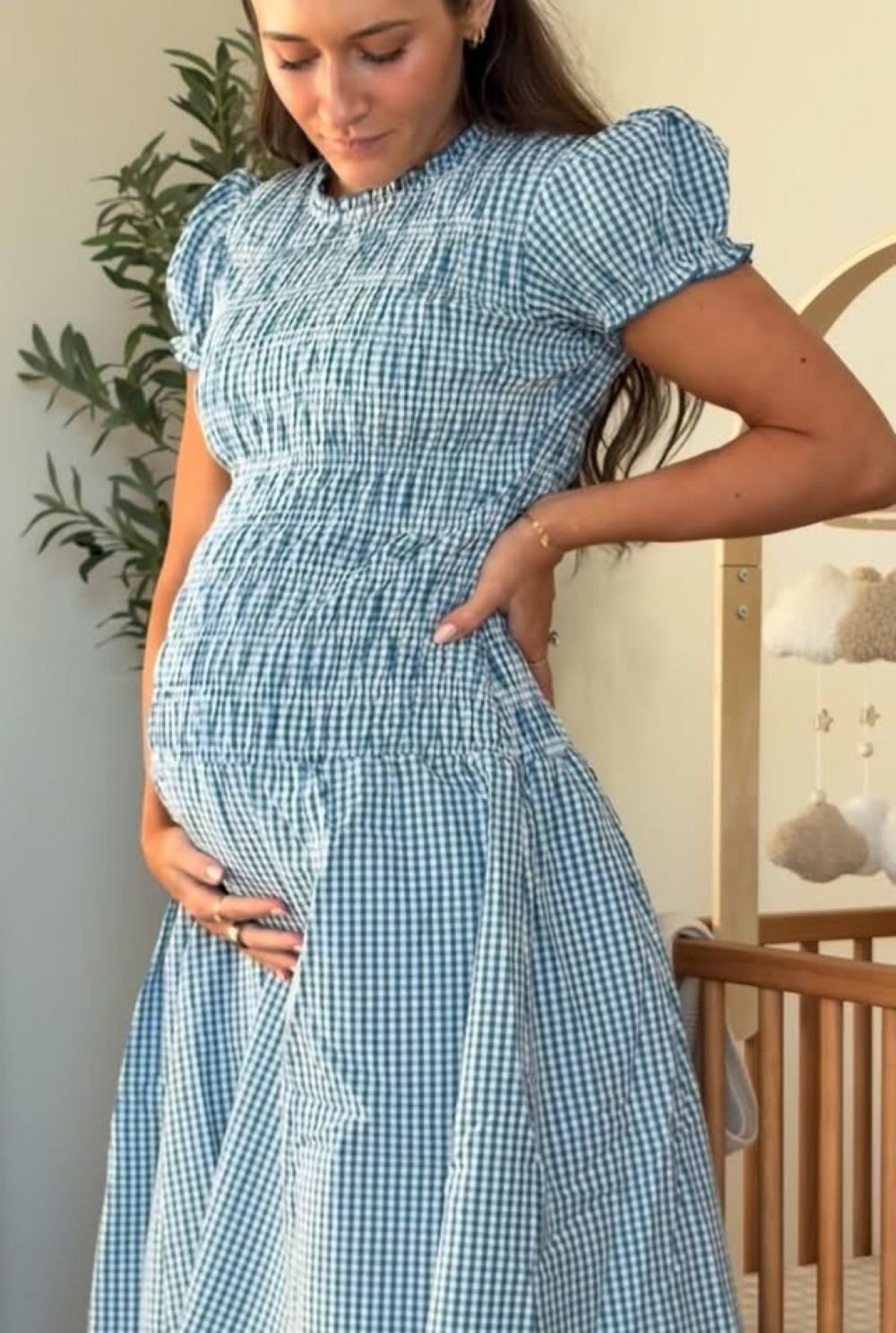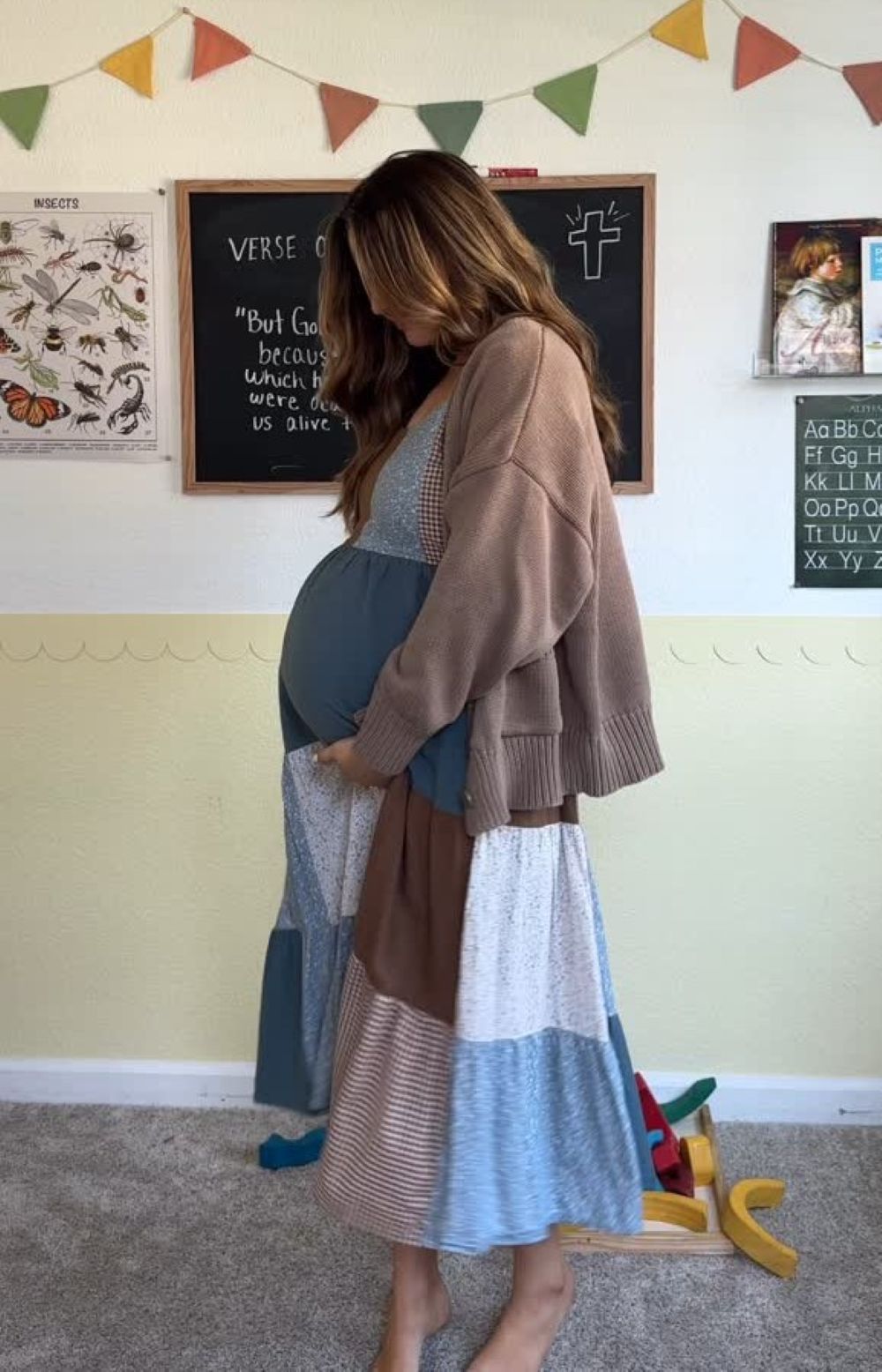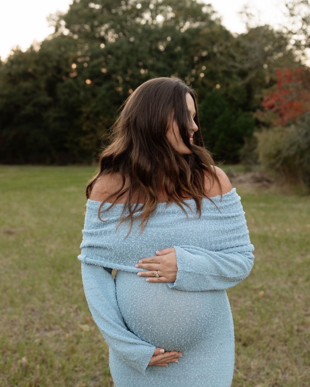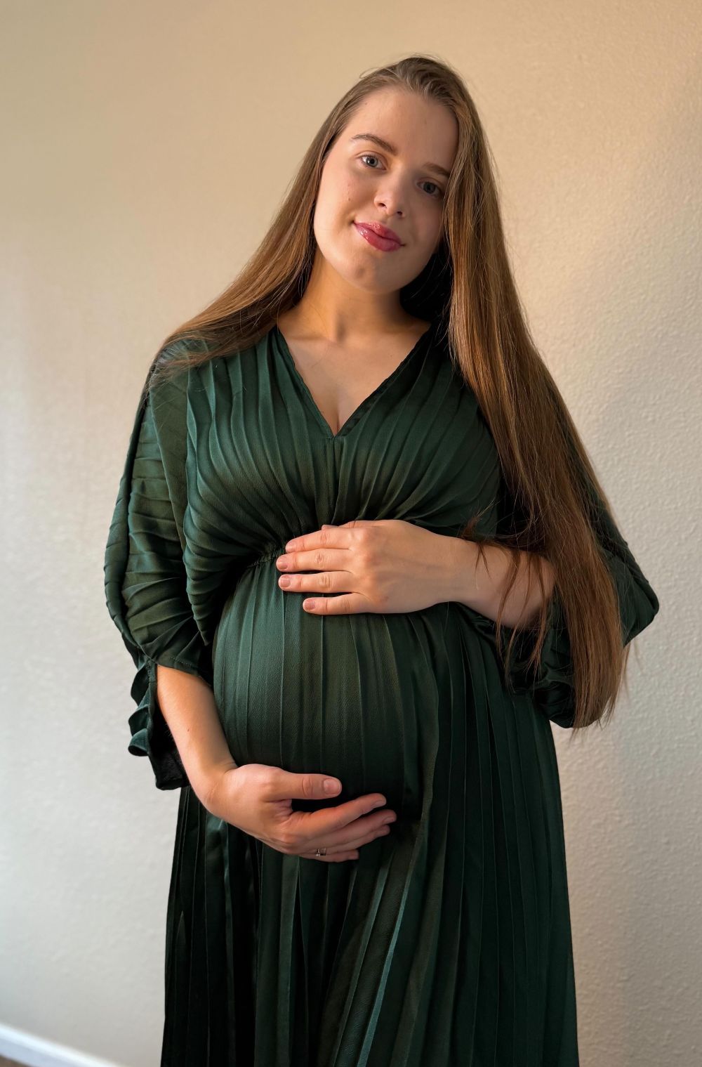 Soft sage and this unique silhouette are a gorgeous combination, and I love this for a modern gender reveal outfit idea.