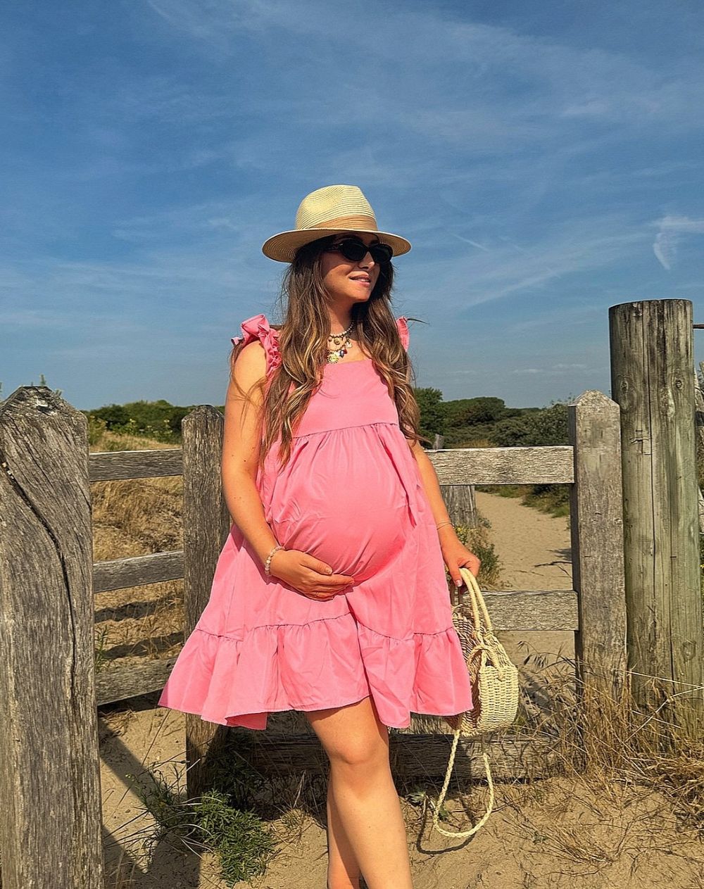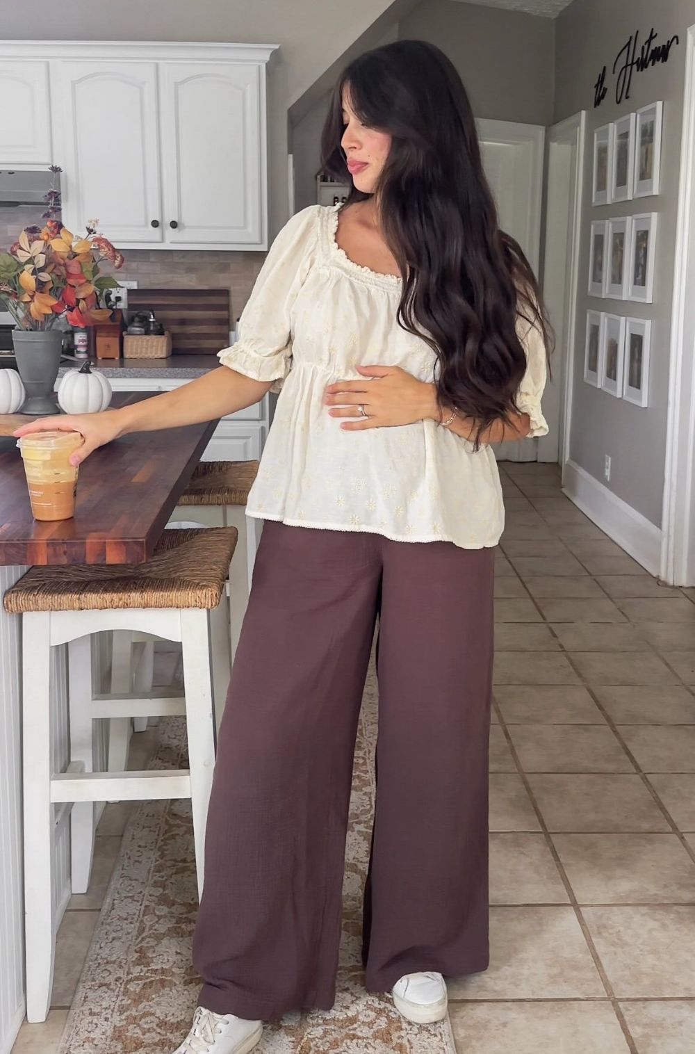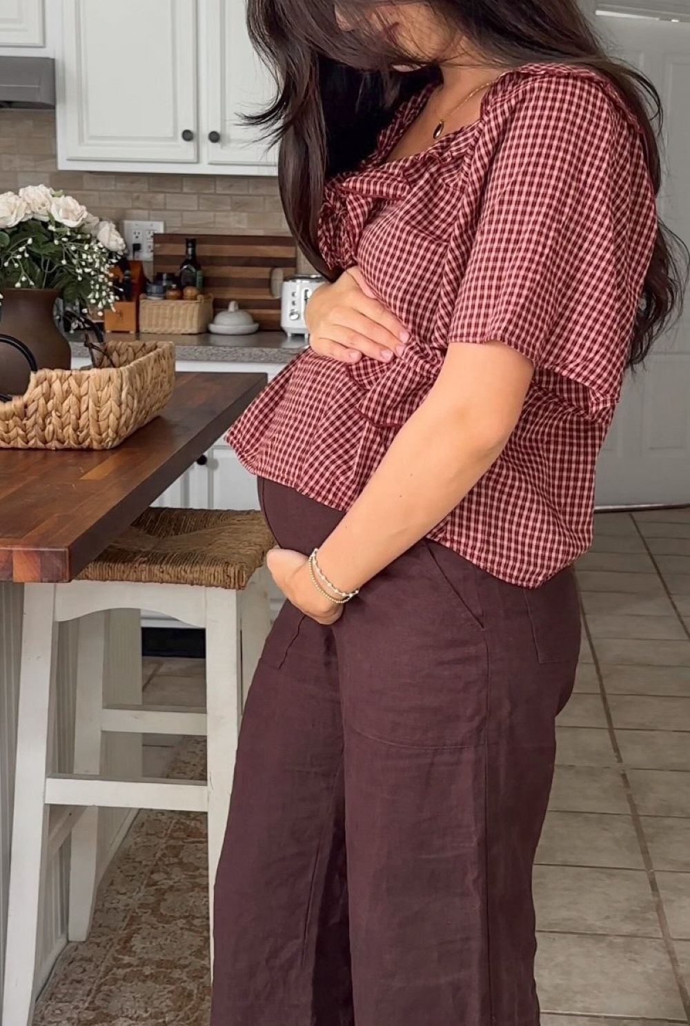 Looking for a gender reveal outfit idea with pants? Pair loose, linen pants with a feminine maternity top for something cute and unique.
