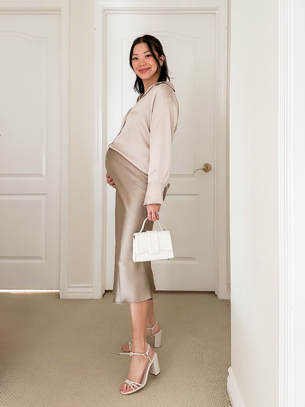 A neutral, satin midi skirt with a flowing cream top comes together for a sophisticated aesthetic. I think this would be perfect for a high-class gender reveal party.