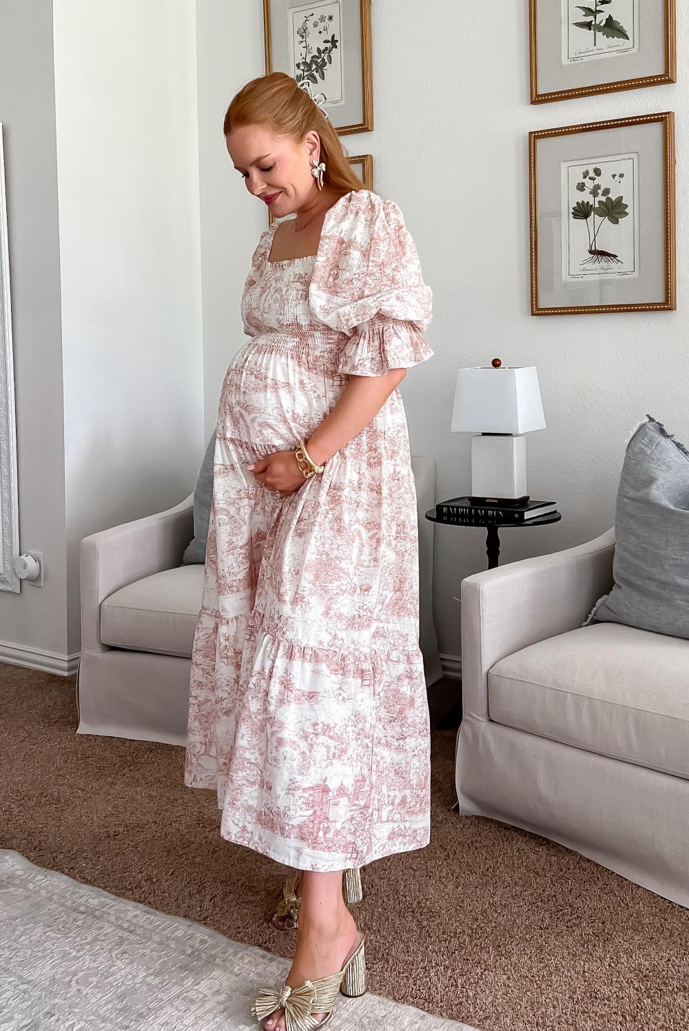 Toile de Jouy is one of my favorite patterns for something unique and timeless, and I really love this option in either pink or blue for a gorgeous gender reveal outfit.