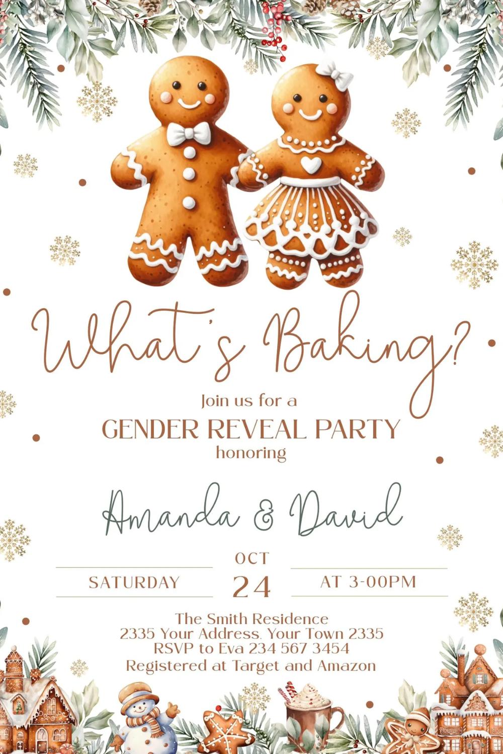 Use a gingerbread boy and girl to decorate a Christmas-inspired cake for a What’s Baking? gender reveal theme!