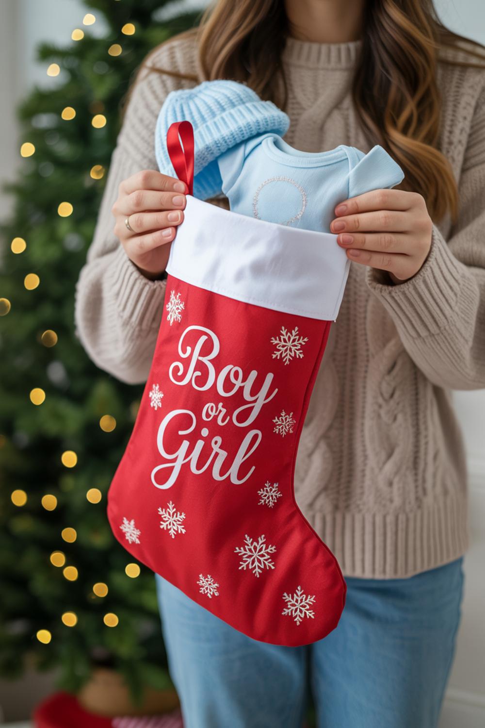 Fill a knit stocking with a long, colored ribbon so you and your partner can reach in and pull out the surprise for everyone to see! You can also stuff a stocking with blue or pink baby items like a onesie and knitted hat for your cute reveal.